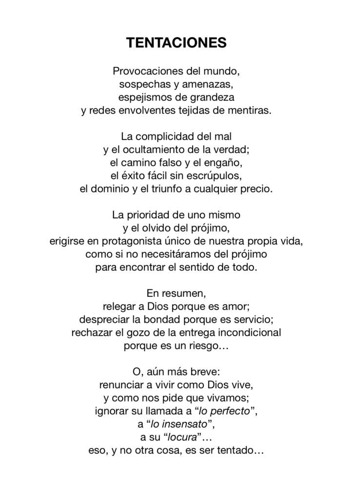 TENTACIONES Por juanleon|2026-02-21T09:22:46+01:00febrero 21st, 2026|General, Oraciones y música, Orar|Sin comentarios Comparte este post! Elige tu plataforma! FacebookTwitterLinkedInWhatsappGoogle+TumblrPinterest Artículos relacionados CEGUERA CEGUERA marzo 14th, 2026 | Sin comentarios LA SAMARITANA LA SAMARITANA marzo 7th, 2026 | Sin comentarios TRANSFIGURACIÓN TRANSFIGURACIÓN febrero 28th, 2026 | Sin comentarios MIÉRCOLES DE CENIZA MIÉRCOLES DE CENIZA febrero 18th, 2026 | Sin comentarios INCONFORMISMO INCONFORMISMO febrero 14th, 2026 | Sin comentarios Deja tu comentario Cancelar la respuestaComentar Save my name, email, and website in this browser for the next time I comment. Δ