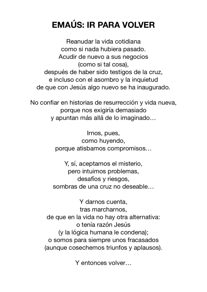 EMAÚS: IR PARA VOLVER Por juanleon|2026-04-18T15:31:30+01:00abril 18th, 2026|General, Oraciones y música, Orar|Sin comentarios Comparte este post! Elige tu plataforma! FacebookTwitterLinkedInWhatsappGoogle+TumblrPinterest Artículos relacionados LA DUDA DE TOMÁS LA DUDA DE TOMÁS abril 11th, 2026 | Sin comentarios PASCUA PASCUA abril 4th, 2026 | Sin comentarios VIERNES SANTO VIERNES SANTO abril 3rd, 2026 | Sin comentarios JUEVES SANTO JUEVES SANTO abril 2nd, 2026 | Sin comentarios DOMINGO DE RAMOS DOMINGO DE RAMOS marzo 28th, 2026 | Sin comentarios Deja tu comentario Cancelar la respuestaComentar Save my name, email, and website in this browser for the next time I comment. Δ
