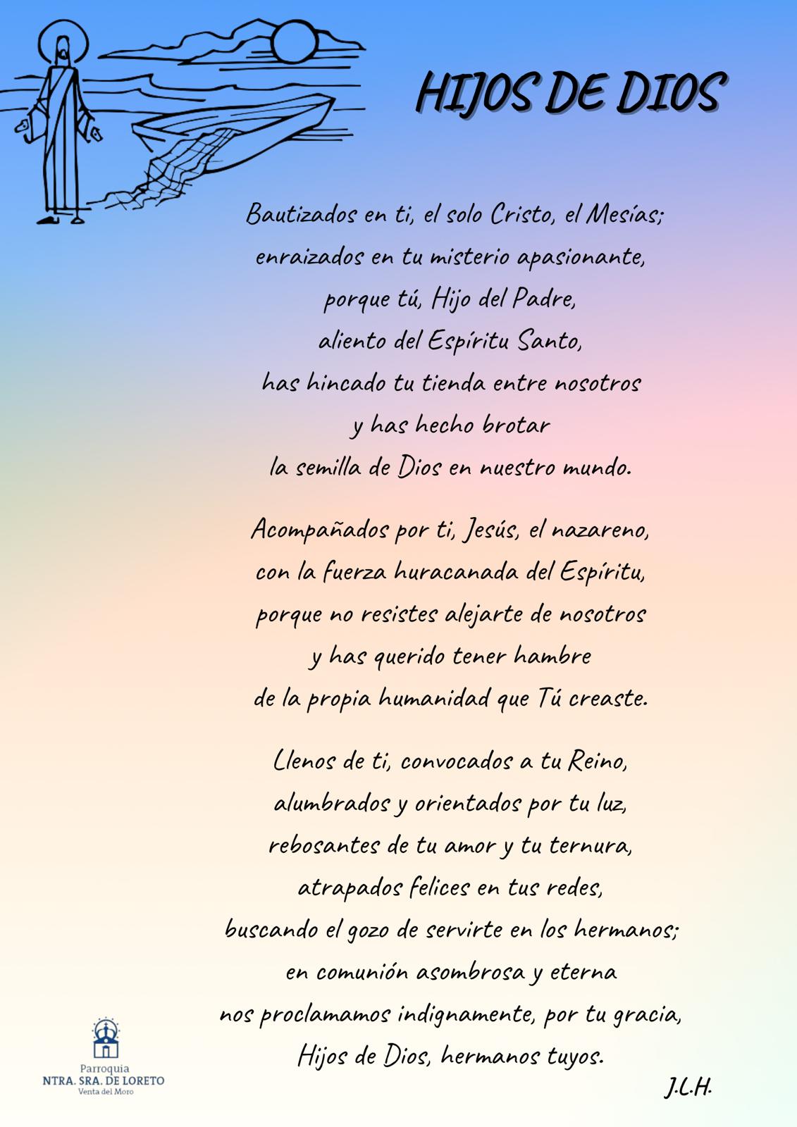 Bautizados en ti, el solo Cristo, el Mesías; enraizados en tu misterio apasionante, porque tú, Hijo del Padre, aliento del Espíritu Santo, has plantado tu tienda entre nosotros y has hecho brotar la semilla de Dios en nuestro mundo. Acompañados
